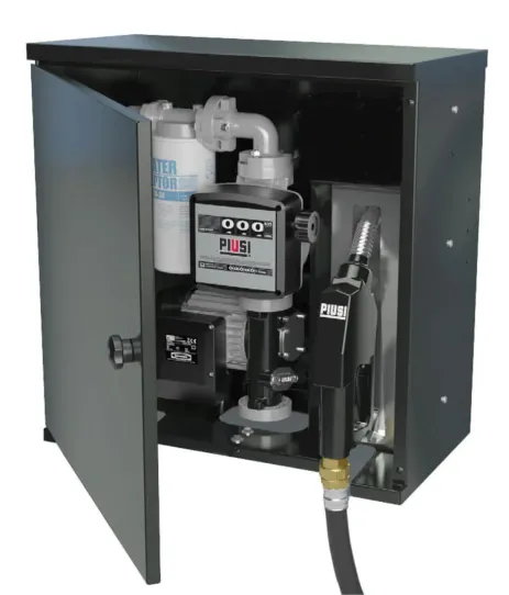 Заправочный блок, оснащённый насосом, расходомером, фильтром и металлическим защитным корпусом с замком.